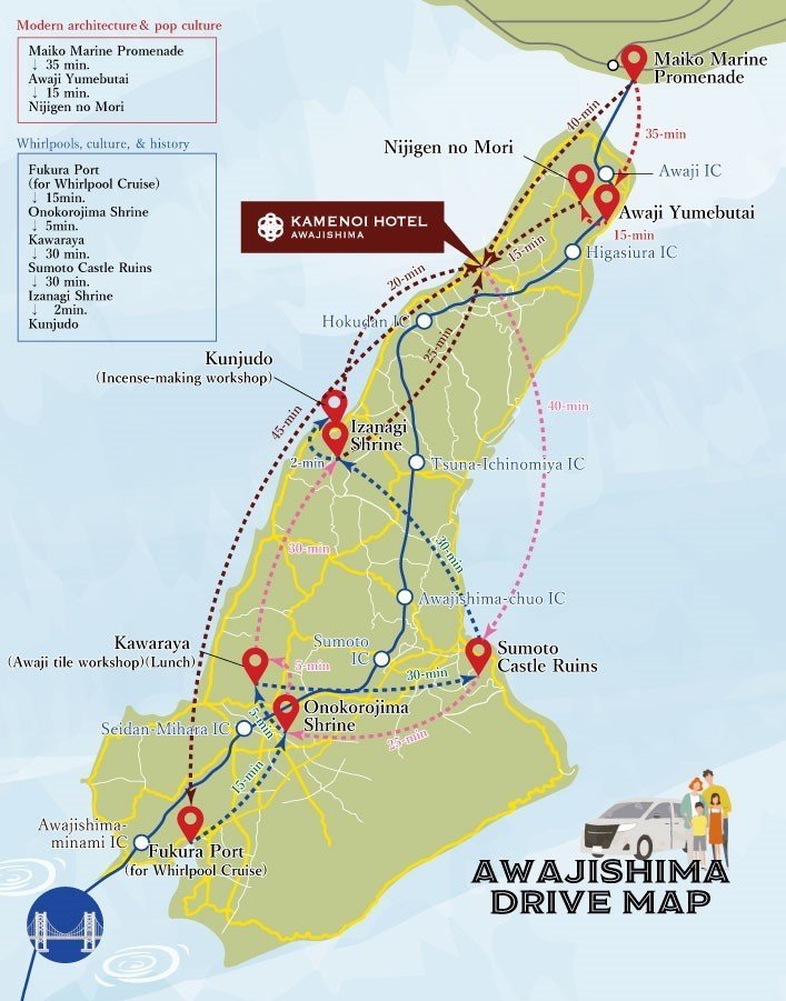 If you are looking for some trip inspo, check out two of our day-trip itineraries below—all of which start and end at Kamenoi Hotel Awajishima. Car travel is the most convenient way to get around the island, so the below itineraries utilize rental cars to optimize time.