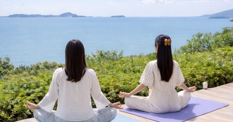 静かな海、やわらかな光、澄んだ空気。 ヨガマットを広げ、深く呼吸を整える。