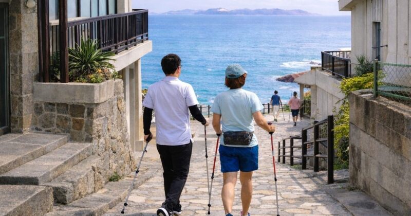 ノルディックポールを手に 海へ続く道を歩く。