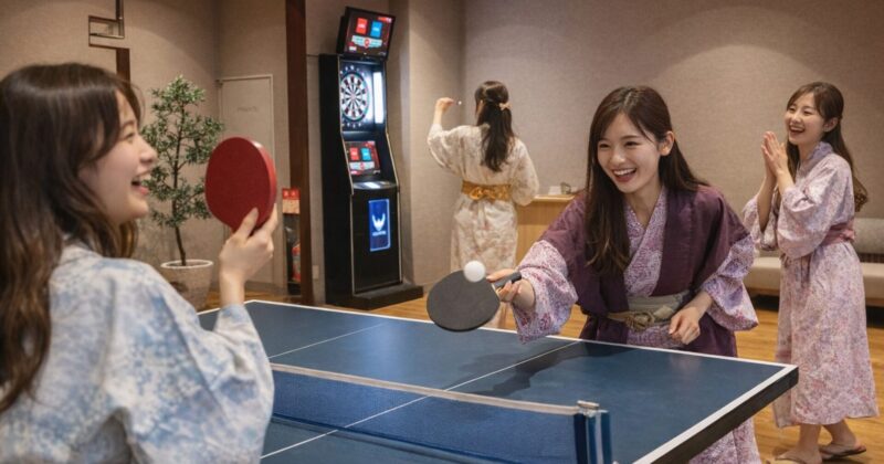 湯上がりの一杯のあとに、もうひと遊び。 卓球やダーツで、自然と笑顔がこぼれる。