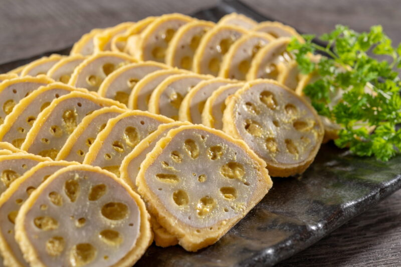 Karashi Renkon: This traditional Kumamoto dish is made by stuffing boiled lotus root with a mixture of Japanese mustard and miso. It is then coated in a batter of flour and egg yolk and deep fried, giving it an addictive crunch and bold flavor.