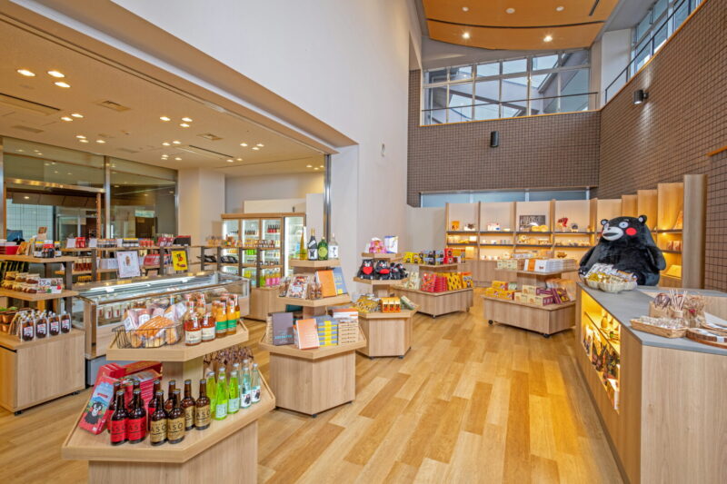 The shop sells products made by local artisans (including soaps, tea, and aroma oils), a wide selection of regional products (like sake and dairy goods), and adorable Kumamon merchandise (such as hats and plushies).