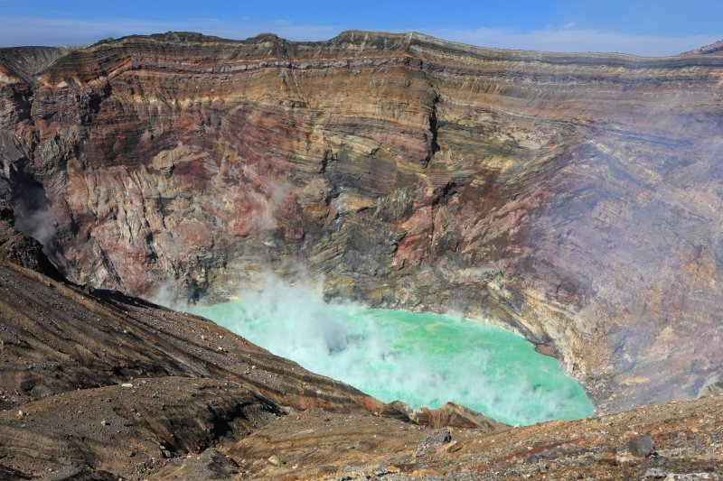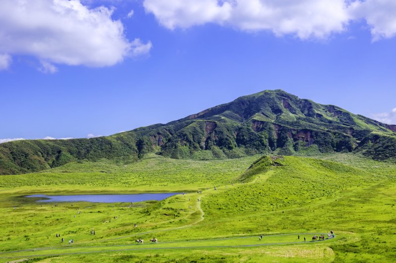 - Mount Nakadake (1,506m): This active volcano rests at the center of the Five Mountains of Aso. Considered one of Japan’s most active volcanoes, Mt. Nakadake is popular for its observable crater, emerald-green volcanic lake, and nearly ever-present volcanic smoke—a rare experience worldwide. Although the crater may be inaccessible due to volcanic activity, it is a must-see if it is open. You can easily reach the mountain by local bus from Aso Station.
