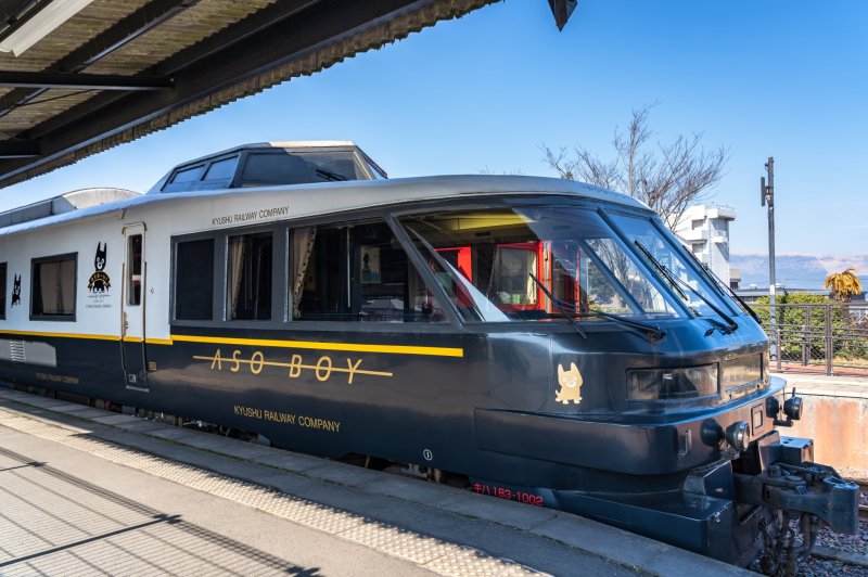 If you are looking for an extra special train experience, consider boarding the sightseeing Limited Express train Asoboy, operated by JR Kyushu.