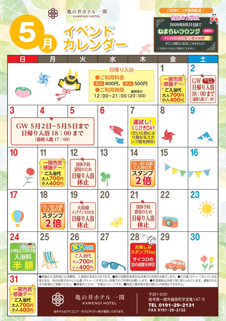 2일~5일까지는 당일치기 입욕 18시까지(최종 접수 17시).