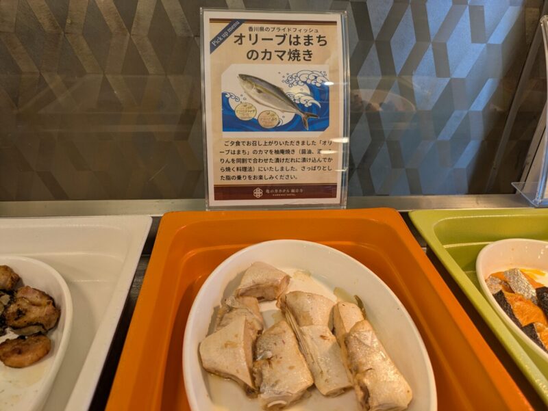 현재 호텔은 Kagawa 자랑의 물고기 "올리브 하마치"를 저녁 식사와 조식 뷔페로 제공하고 있습니다.