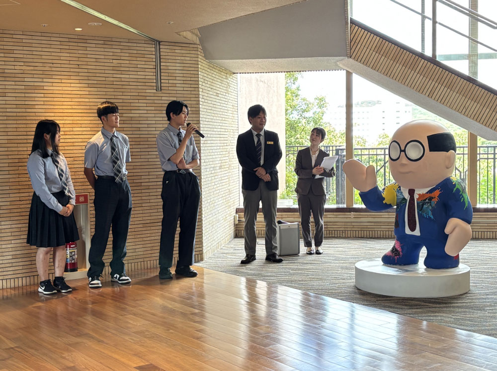 若い感性が描く“ご当地デザイン”を纏った、創業者・油屋熊八の像がホテルロビーでお出迎え