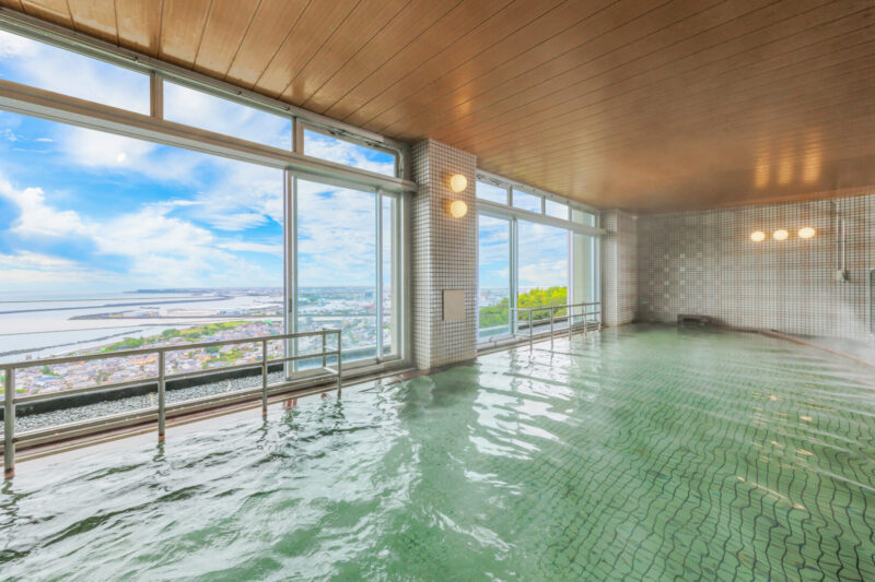 On the top floor, the hotel has a large public observation bath with wide windows that overlook Suruga Bay and Yaizu.