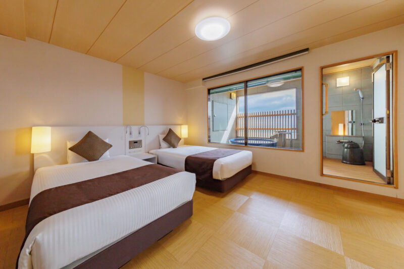 ● Special Japanese-Western room with a private open-air bath (ocean view): This luxurious space offers panoramic views of Suruga Bay.